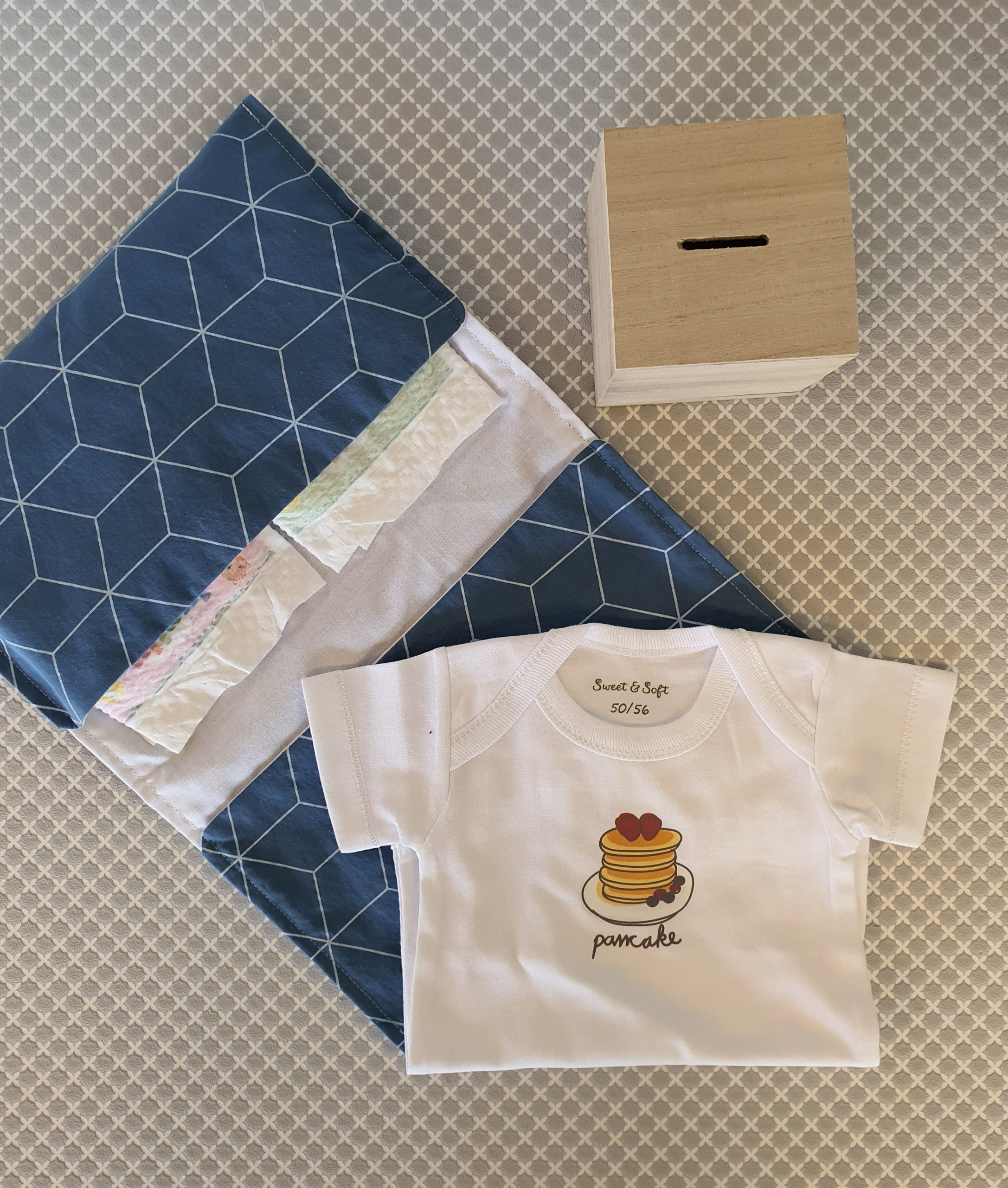 Kraampakket A bestaat uit een luieretui, rompertje en spaarpot.