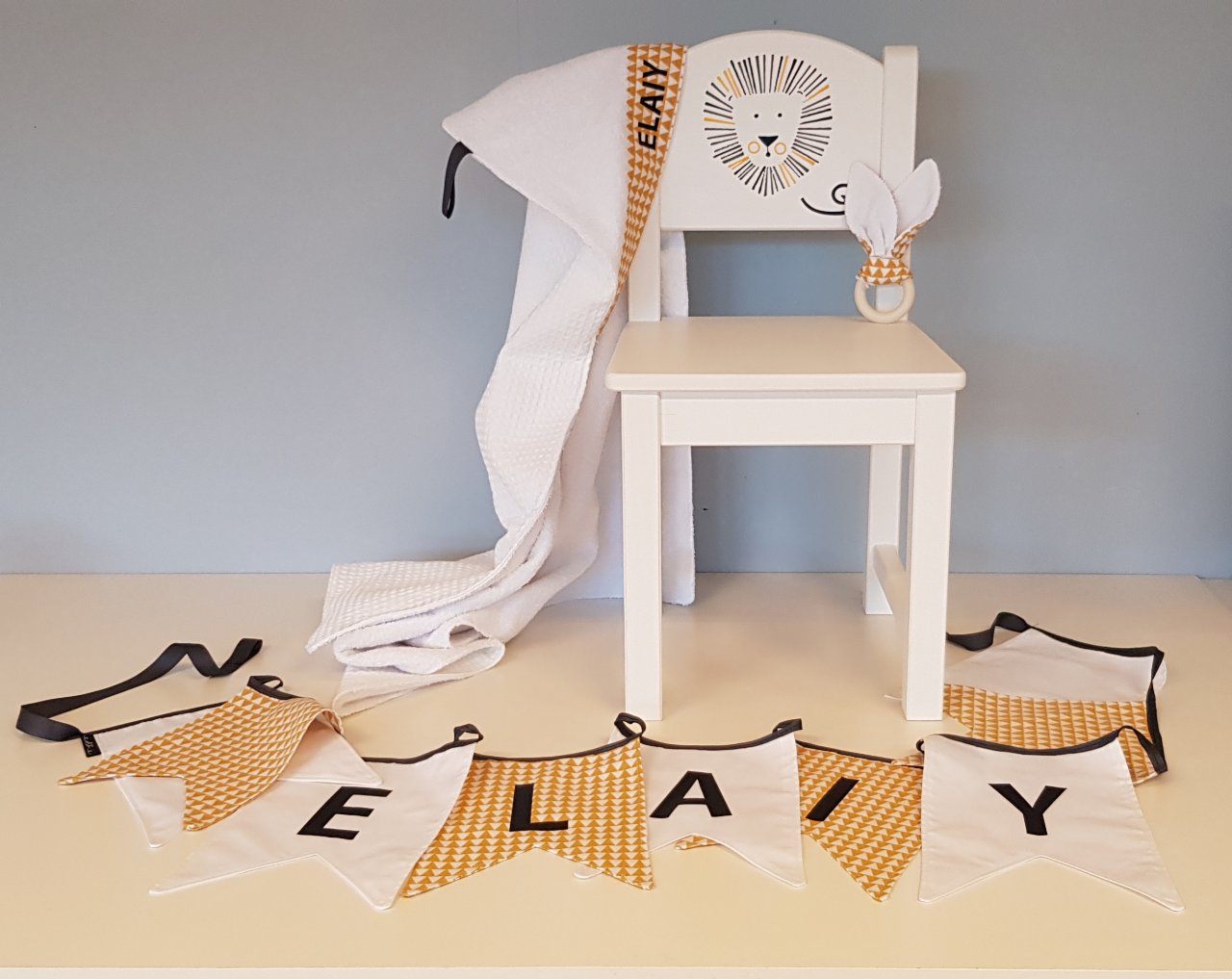 Pakket J bestaat uit een stoeltje, badcape, slinger en knuffeloortjes.